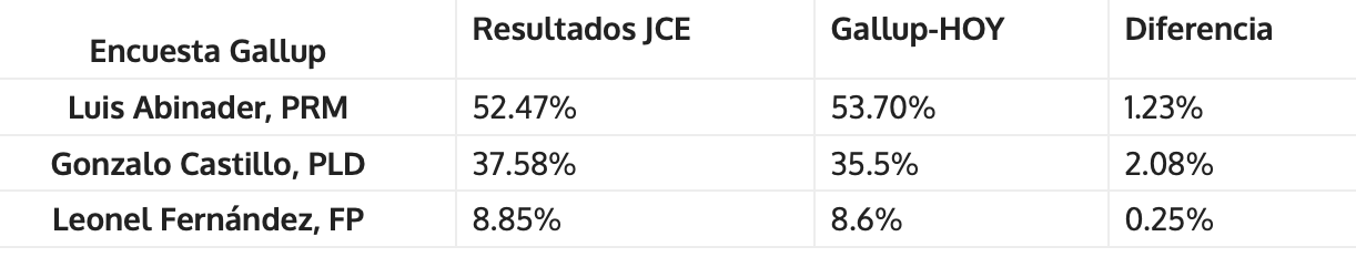 La comparación de los resultados de Gallup-Hoy con los del conteo de los votos en la Junta Central Electoral coinciden, y la variación que ocurrió se ubica dentro del margen estimado de error de +-3%.