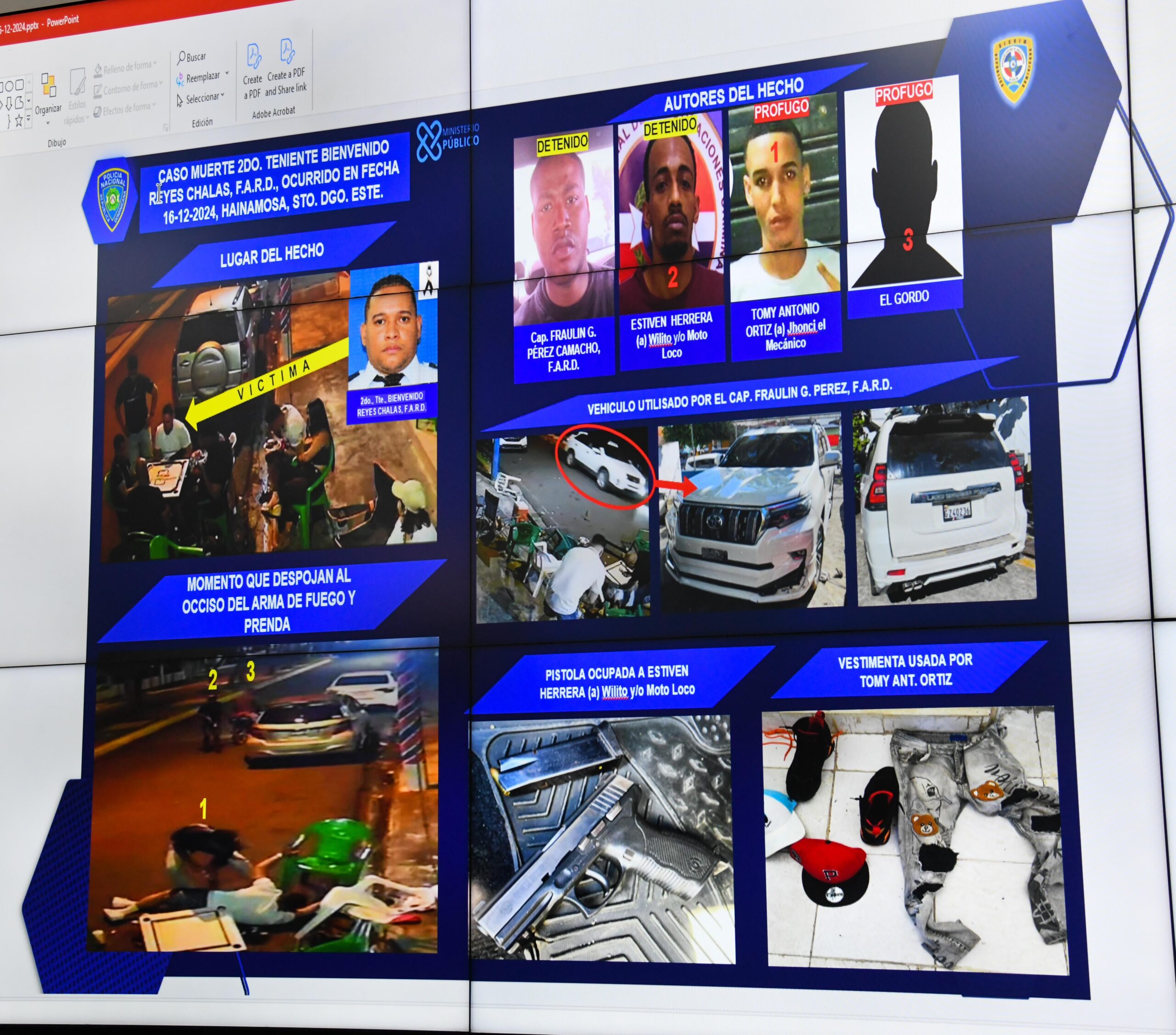 Los detenidos son el capitán de la FARD Fraylin G. Pérez Camacho y Estiven Herrera, alias “Wilito” y/o “Moto”. Además, las autoridades identificaron a otros dos participantes que permanecen prófugos: Tommy Antonio Ortiz, alias “Jhonci el Mecánico”, y un individuo conocido como “El Gordo”, activándose su localización.
