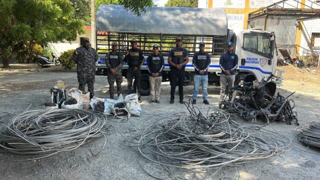 *La Vega.–* La Subdirección Regional de Inteligencia (DINTEL), bajo la dirección central del coronel abogado Francisco Alb. Pérez Encarnación, ocupó una gran cantidad de rollos de alambres de aluminio de alta tensión, chasis de pasolas picados y sacos de alambres quemados, durante dos allanamientos realizados en distintos puntos de esta ciudad, donde además fue detenido un hombre con orden de arresto pendiente en su contra.