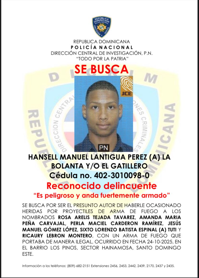 Santo Domingo Este.-La Policía Nacional informó este viernes que activa la búsqueda de un reconocido antisocial señalado como el presunto responsable de ocasionar heridas de bala a seis personas durante un conflicto social ocurrido en una fiesta clandestina, la noche del miércoles 23 de octubre, en el sector Los Pinos de Hainamosa, de este  municipio.