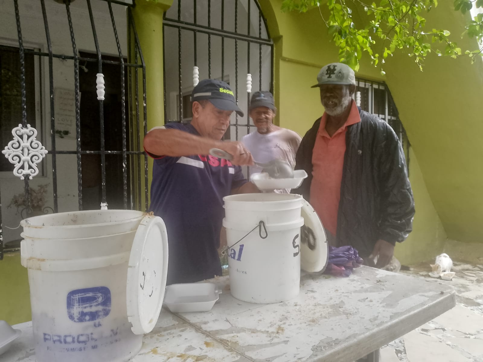 Santo Domingo Este.- El presidente de la junta de vecinos Sagrada Familia, profesor Moisés Feliz, se mantuvo entregando a los moradores de su sector alimentos cocidos de los Comedores Económicos, a pesar de las fuertes lluvias.