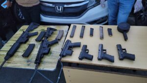 Durante la intervención se ocuparon armas de alto poder, entre ellas un fusil M4 Carbine 5.56mm con 27 cápsulas, un fusil DPMS A-15 con 29 cápsulas, una Uzi Luger modelo TEC-9, dos pistolas Glock 9mm (una con cargador de 15 y otra con cargador tipo caracol de 50 cápsulas), así como otra pistola 9mm sin serie y un cargador de 30 cápsulas.